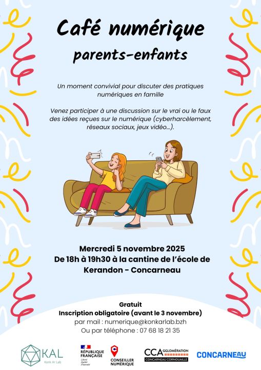 L'association Konk Ar Lab, en partenariat avec CCA et la ville de Concarneau, va développer des actions autour du numérique dans les familles (temps des écrans, réseaux sociaux, jeux vidéo, etc.). Afin d'identifier les attentes des familles en matière de sujets, d'usages à aborder et de répondre au mieux à vos besoins, nous avons préparé un questionnaire.